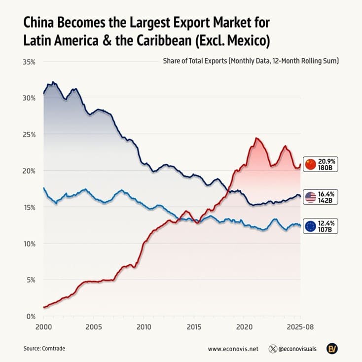 China now absorbs ~21% of Latin America’s exports (~$180B annually), surpassing the US and EU. Anchored in resources and reinforced by infrastructure, this corridor is structurally redrawing commodity pricing power, supply chains, and geopolitical leverage.